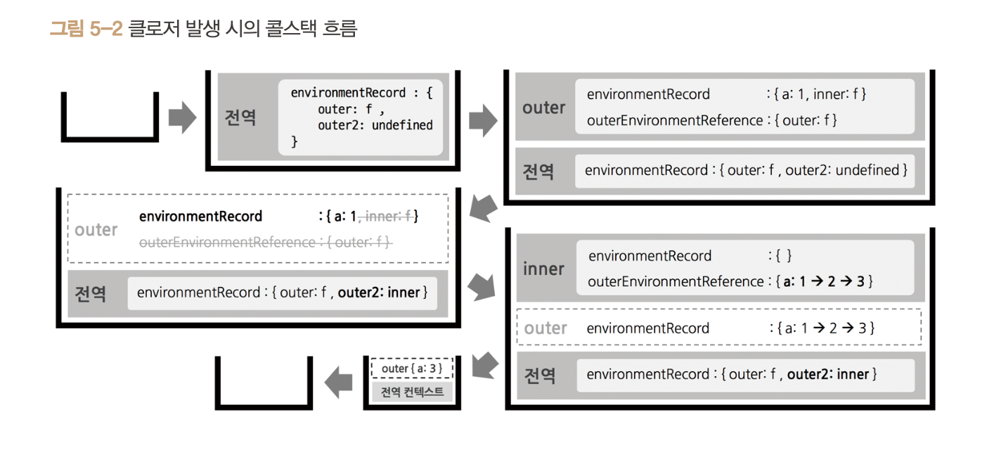 inner 함수 내부에서는 외부환경에서 a를 참조하지만 outer() 함수 종료 시점에는 inner() 함수도 종료되어 있기 때문에 a를 참조하지않습니다.