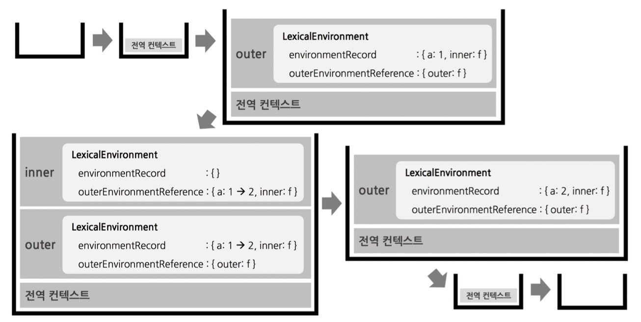 inner가 ++a 를 해줘야하는데 inner() 환경레코드에는 없으니 밖으로가서 외부환경을 참조합니다.