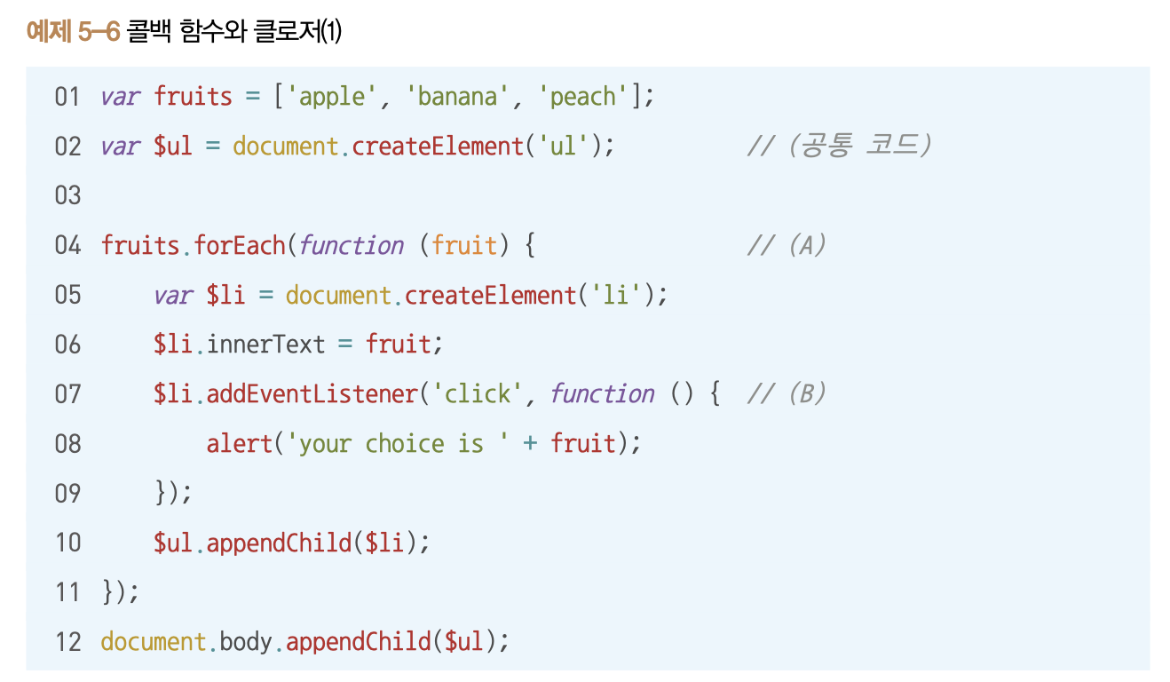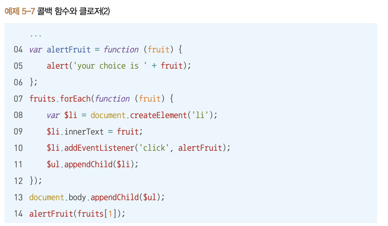 forEach 콜백함수 안에서 addEventListener는 fruit 을 외부에서 참조하고 있습니다.