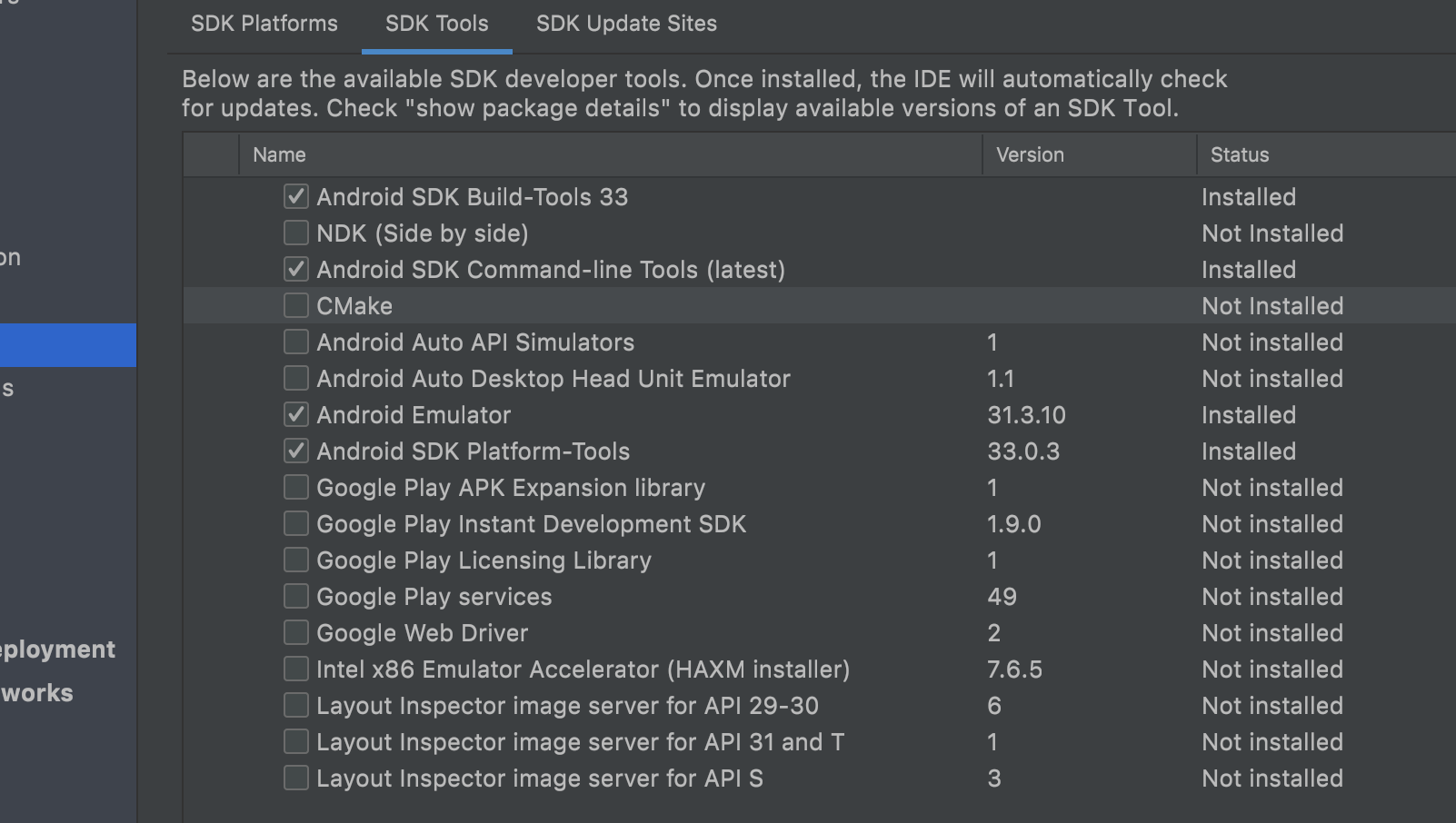 안드로이드 스튜디오를 설치해주고 build-tools 33 command-line tools(latest) sdk platform-tools 3가지를 다운받아준다.