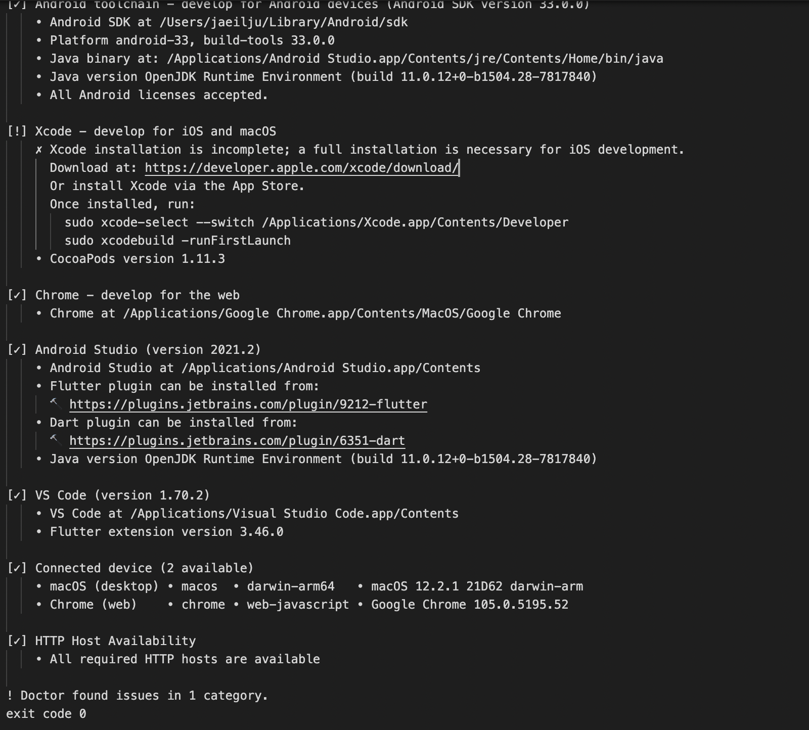 run flutter 를 하고 나면 실행에 앞서 아직 셋팅이 안된 부분을 이슈로 알려준다.