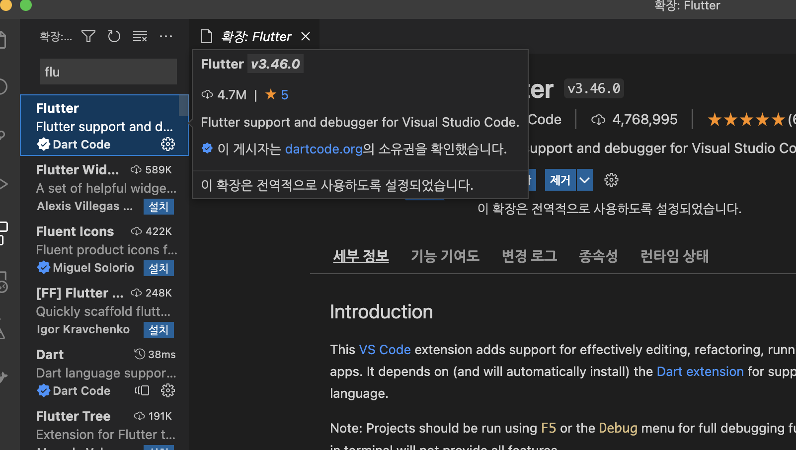 flutter 익스텐션을 설치하면 dart 가 같이 설치되는데 혹시나 됬나 확인하고 안됬으면 같이해줘야함