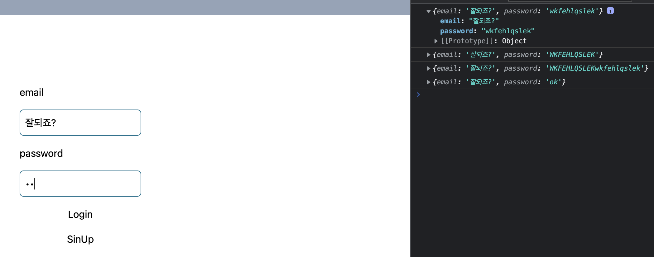 위에는 login page 라고 생각하고 email 과 password 2개의 input 을 만들어봤다.