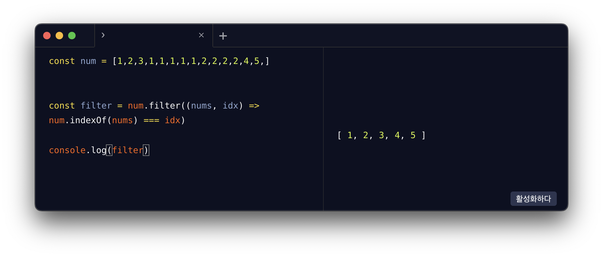 indexOf 를 활용하여 1번의 숫자가 몇번째 인덱스에 존재하는지 확인 후에 배열의 filter loop 안 index 와 부합한지 확인 후 filter 메서드의 특징의 참인 값만 return 받는 로직입니다.