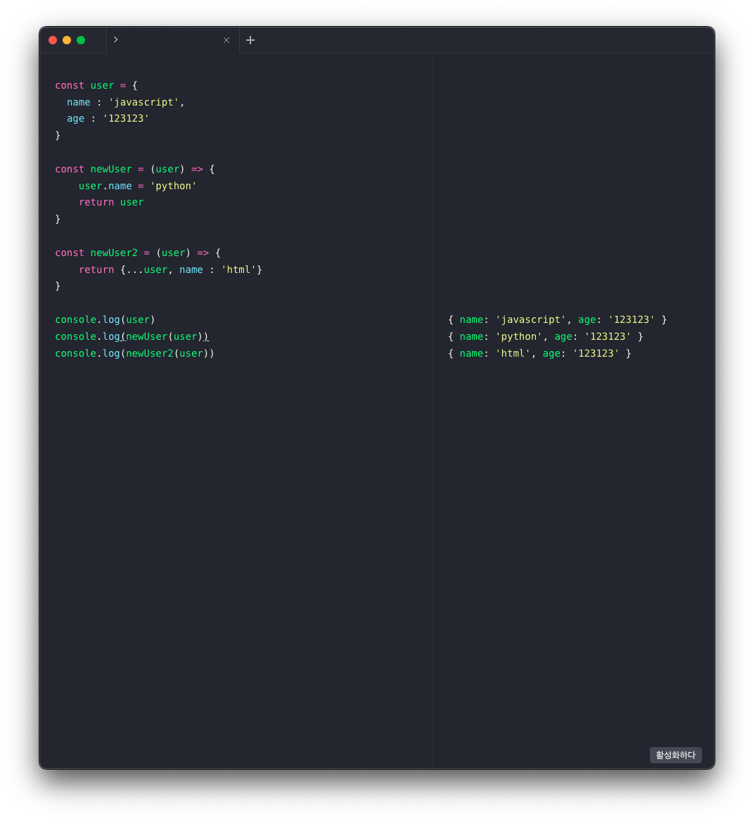 newUser2 와 같이 얕은복사 혹은 깊은복사로 객체를 원본을 유지한채 복사한 값으로 새로운 결과를 반환함으로써 원본 데이터의 불변성을 유지시켜야한다.
