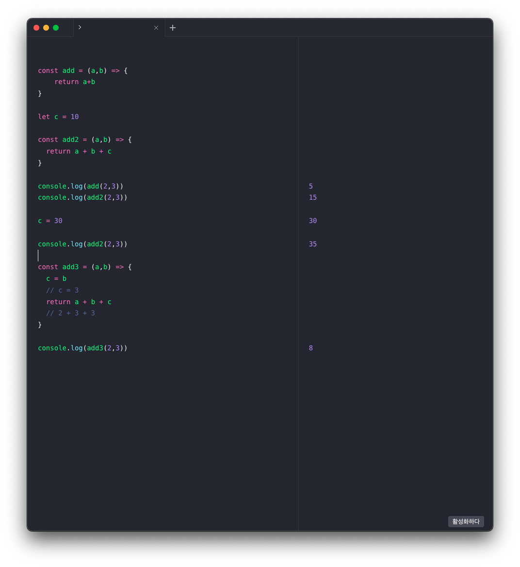 add3 은 함수가 외부 변수를 변경하고있다. c 는 앞서 30으로 변수에 재할당을 해줬지만 add3 안에서 다시 b 의 값인 3으로 재할당해줬고 결론은 2 + 3 + 30이 아닌 2 + 3 + 3 의 결과로 8이 출력됬다.