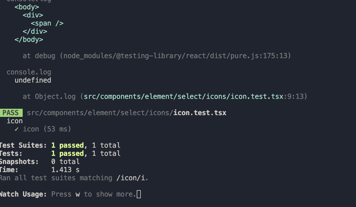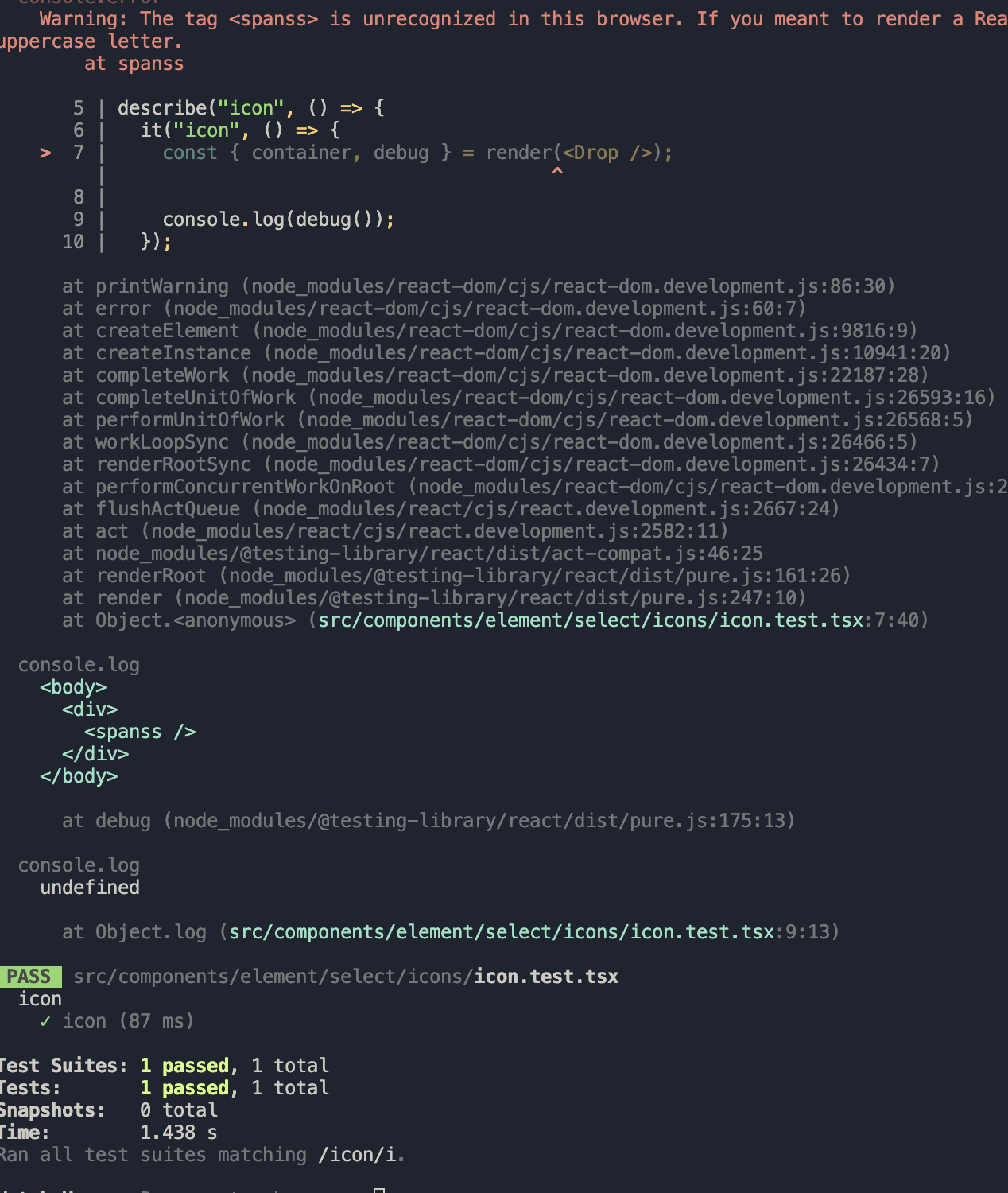 여기 같은 경우는 ReactComponent 에 span 이 아닌 spansss 이런 없는 태그를 적으면 테스트는 통과하지만 에러를 내뱉게 된다.
