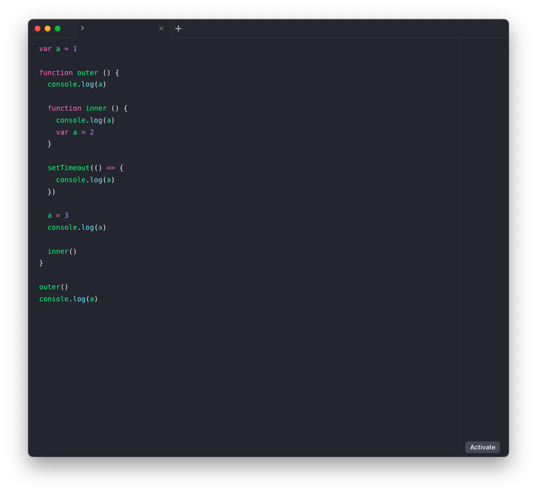6) 마지막으로 console.log(a) 도 전역 변수의 a를 참조하여 3을 출력합니다.