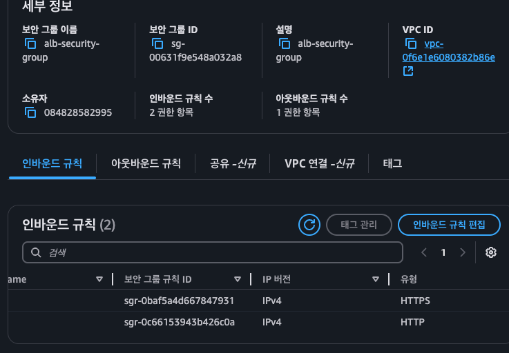 - ALB 보안그룹: 인바운드 80, 443 포트 (0.0.0.0/0)