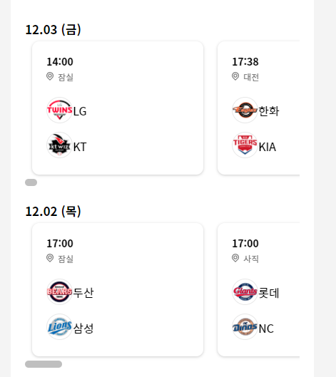 - 이제 list에는 12월3일 경기가 3개가 될 수 있고 4개가 될 수 있고 많을 수 있습니다.
