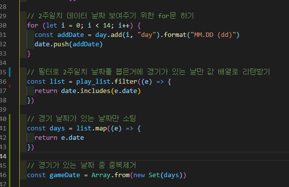 dayjs.add(14일 날짜 ++, "day).format() 서버와 형식을 맞춰줌 - 날짜를 date라는 ary에 담아두고 서버에서 내려준 데이터 play_list에 filter를 걸어 해당날짜가 포함된 경기들만 다시 list에 담아둠