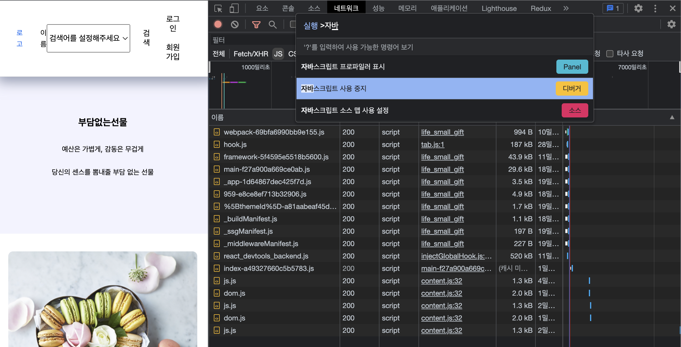 배포 환경에서도 마찬가지로 자바스크립트를 off 하더라도 이미 스테틱한 Html이 있기 때문에 화면 단에서는 차이를 모르겠지만