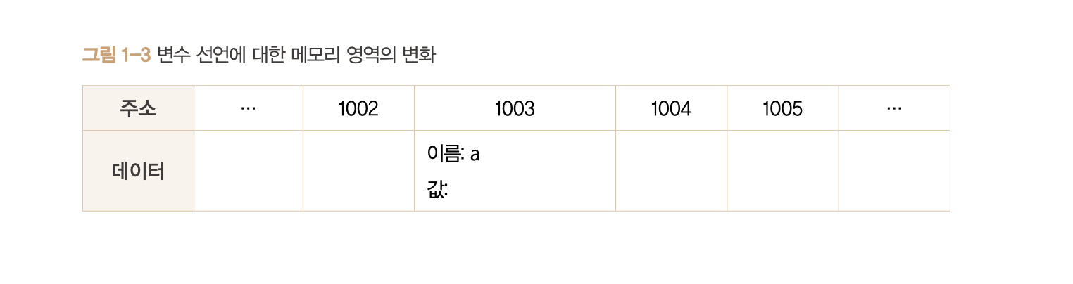 변수 a를 선언 했을 시 메모리의 임의의 주소 1003번에 a 라는 식별자(변수 명)로 메모리가 비어있는 공간 하나를 확보하게 됨,