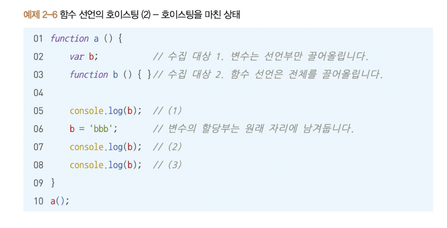 엔진의 실제 동작 방식대신 자바스크립트 엔진은 식별자들을 최상단으로 끌어올려놓은 다음 실제 코드를 실행한다. 라고 생각하더라도 코드를 해석하는데 문제가 없다. (호이스팅)