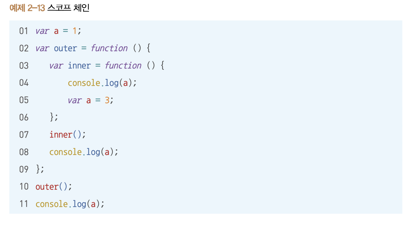 식별자의 유효범위, 스코프를 안에서 바깥으로 차례로 검색해나가는 것을 스코프 체인이라 함,