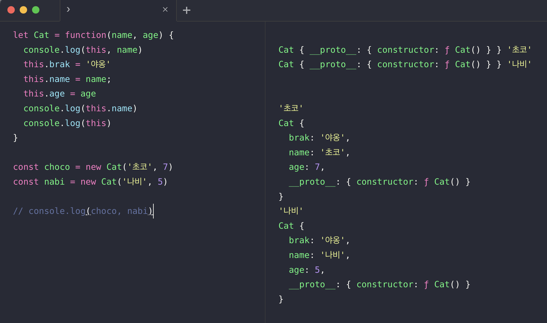 1. 처음 Cat 안의 this 는 빈 객체(인스턴스)이고, name을 인자로 받아왔다.