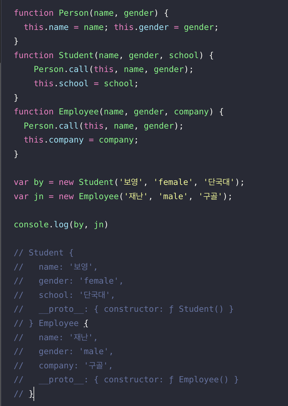 생성자 함수를 호출하면 우선 생성자의 prototype (프로토타입) 프로퍼티를 참조하는 __proto__ 라는 프로퍼티가 있는 객체를 만들고, 미리 준비 된 속성 및 개성을 해당 객체(this)에 부여하면서 인스턴스가 만들어진다